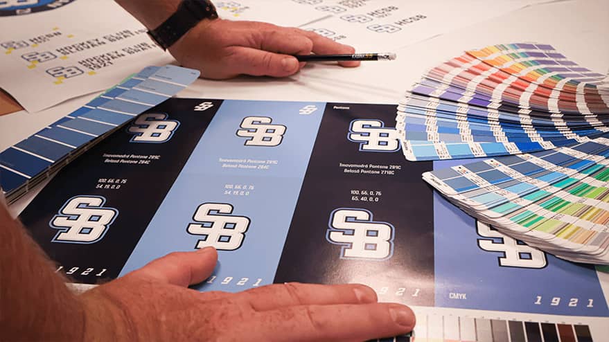 Základnou farebnou kombináciou dresov je tmavomodrá pre tmavé dresy a belasá pre svetlé dresy. Doplnené sú prvkami druhej základnej farby a bielej farby. Centrálnym prvkom je podľa pravidiel alebo zvyklostí daného športu buď základné logo SB alebo nápis SLOVAN. Na ostatnom klubovom oblečení sa využívajú aj badge verzie loga.